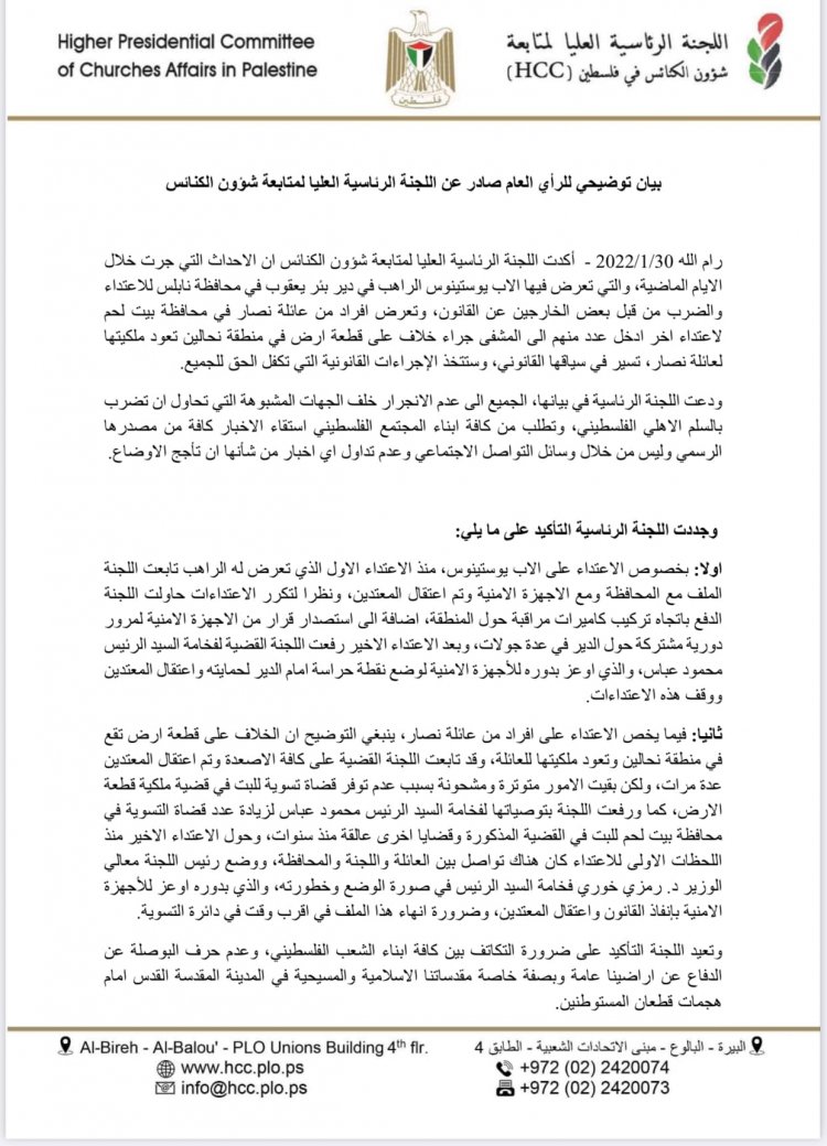 القيامة- أكدت اللجنة الرئاسية العليا لمتابعة شؤون الكنائس في فلسطين، في بيان أصدرته أمس أن "الأحداث التي جرت خلال الأيام الماضية، والتي تعرض فيها الأب يوستينوس الراهب في دير بئر يعقوب في محافظة نابلس، للاعتداء والضرب من قبل بعض الخارجين عن القانون، وتعرض أفراد من عائلة نصار في محافظة بيت لحم لاعتداء آخر،