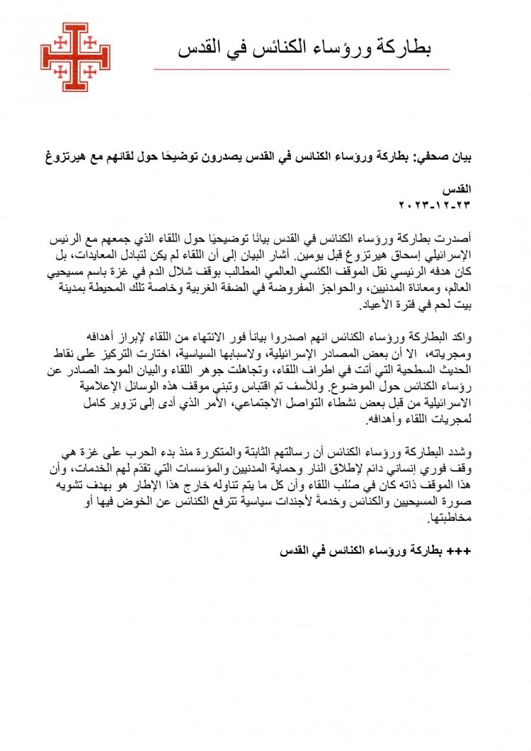 وأكد البطاركة ورؤساء الكنائس أنهم أصدروا بيانًا فور الانتهاء من اللقاء لإبراز أهدافه ومجرياته، إلا أنّ "بعض المصادر الإسرائيليّة، ولأسبابها السياسيّة، اختارت التركيز على نقاط الحديث السطحيّة التي أتت في أطراف اللقاء، وتجاهلت جوهر اللقاء والبيان الموحّد الصادر عن رؤساء الكنائس حول الموضوع. وللأسف، تم اقتباس وتبني موقف هذه الوسائل الإعلاميّة الإسرائيلية من قبل بعض نشطاء التواصل الاجتماعي، الأمر الذي أدى إلى تزوير كامل لمجريات اللقاء وأهدافه".
