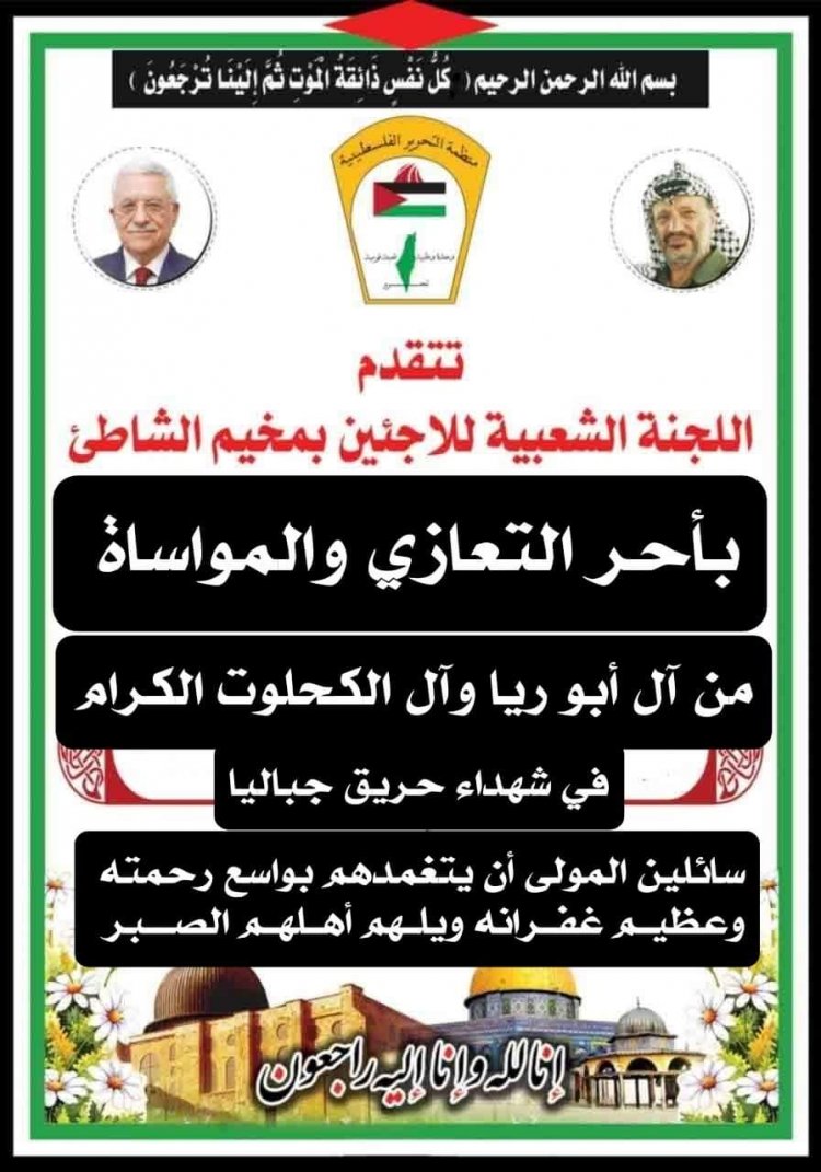 من جهتها نعت دائرة شؤون اللاجئين بمنظمة التحرير الفلسطينية، ولجانها الشعبية في المخيمات ضحايا الحريق في منزل عائلة أبو ريا في مخيم جباليا (تل الزعتر) شمال قطاع غزة، الذي أودى بحياة 21 مواطنا.