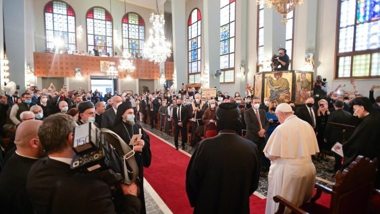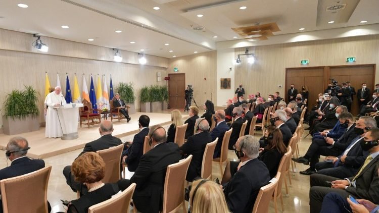 تم الاستقبال الرسمي لقداسته على أرض المطار بحضور السفير البابوي في قبرص، المطران أدولفو تيتو إيلانا وسفير قبرص لدى الكرسي الرسولي، جورجيو بوليديس. بعدها توجّه الأب الأقدس إلى كاتدرائيّة سيدة النعمة للكنيسة المارونيّة في نيقوسيا، حيث التقى الكهنة والرهبان والراهبات وأساتذة التّعليم المسيحيّ والجمعيّات والحركات الكنسيّة في قبرص، وبعد كلمة ترحيب ألقاها البطريرك الماروني مار بشارة بطرس الراعي، وبعد شهادة حياة قدمتها راهبتان تعملان في الجزيرة، وجّه الأب الأقدس كلمة قال فيها: "أنا سعيد لوجودي بينكم. شكراً لكم جميعاً على كهنوتكم وعلى خدمتكم، لا سيما لكنَّ أيتها الاخوات على العمل التربوي الذي تسرنَ به قدمًا في المدرسة الذي يتردد عليها كثيرا أطفال الجزيرة مكان لقاء وحوار وتعلُّم لفن بناء الجسور. شكرًا لكم جميعًا على قربكم من الأشخاص، لا سيما في السياقات الاجتماعية وسياقات العمل حيث يكون الأمر أكثر صعوبة".