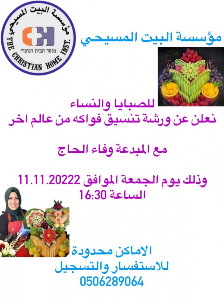 أعلنت مؤسسة البيت المسيحي في حيفا، عن تجديد نشاط المؤسسة في مقرها، بحيث يشمل النشاط فعاليات وورشات عمل لأبناء الشبيبة والبالغين وطلاب المدارس. ومن المقرر أن تبدأ في الأسبوع القادم ورشة تنسيق للفواكه والخضراوات بشكل فني، وهي مخصصة للجنس اللطيف، ولمن يرغب من الشباب. وستدير هذه الورشة الفنانة وفاء الحاج.