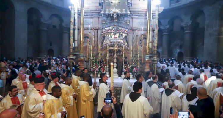 وترأس حارس الاراضي المقدسة، الاب فرانشيسكو باتون قداس أحد الفصح المجيد قبل منتصف الليلة الماضية امام القبر المقدس.