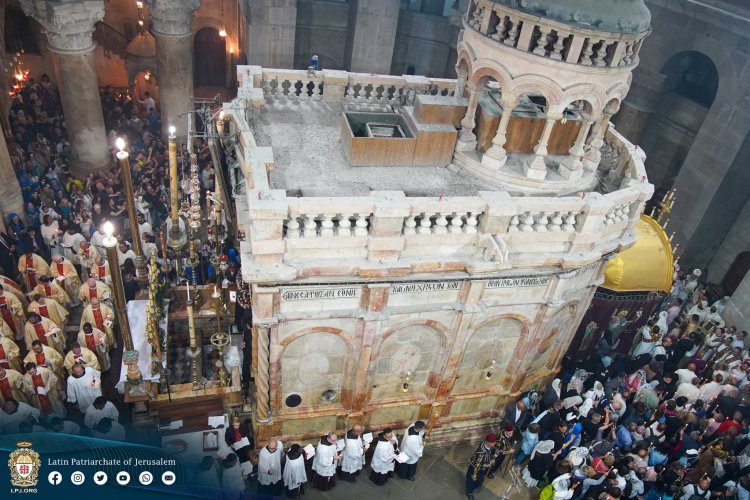 ترأس رئيس الأساقفة، البطريرك بيير باتيستا بيتسا بالا، بطريرك القدس للاتين وسائر الأراضي المقدسة القداس وحفلة النور المقدس أمام القبر المقدس داخل كنيسة القيامة. والقى البطريرك بيير باتيستا عظة عن قيامة السيد المسيح له المجد من القبر الفارغ في اليوم الثالث، ثم قال” المسيح قام حقا قام”، عاونه النائب البطريركي للاتين في القدس وفلسطين، المطران وليم الشوملي والمطران بولس ماركوتسو والقاصد الرسولي رئيس الأساقفة أدولفو تيتو يلانا والاب اسطفان ميلوفيتش ونائب حارس الاراضي المقدسة، الاب ابراهيم فلتس ولفيف من كهنة الاباء الفرنسيسكان بحضور المنسنيور الأب برنارد بوجي، والاب جوني ابو خليل والأب سبيستيان العراقي الفرنسيسكاني ومسؤولي الاستاتيسكو الاب أثاناسيوس ماكورا وسكرتير عام مجلس الاساقفة الكاثوليك الاب بطرس فلييت، وكبار رجال البطريركية اللاتينية ورؤساء من مختلف الابرشيات الكاثوليكية، بحضور حراس القبر المقدس وراهبات الوردية، مار يوسف وشميديت للبنات وعشرات المئات من الحجاج والزوار، والراهبات والرهبان من مختلف الابرشيات والمعاهد والمدارس التعليمية.