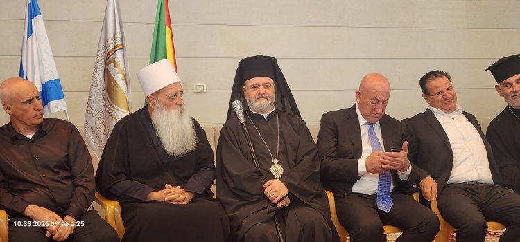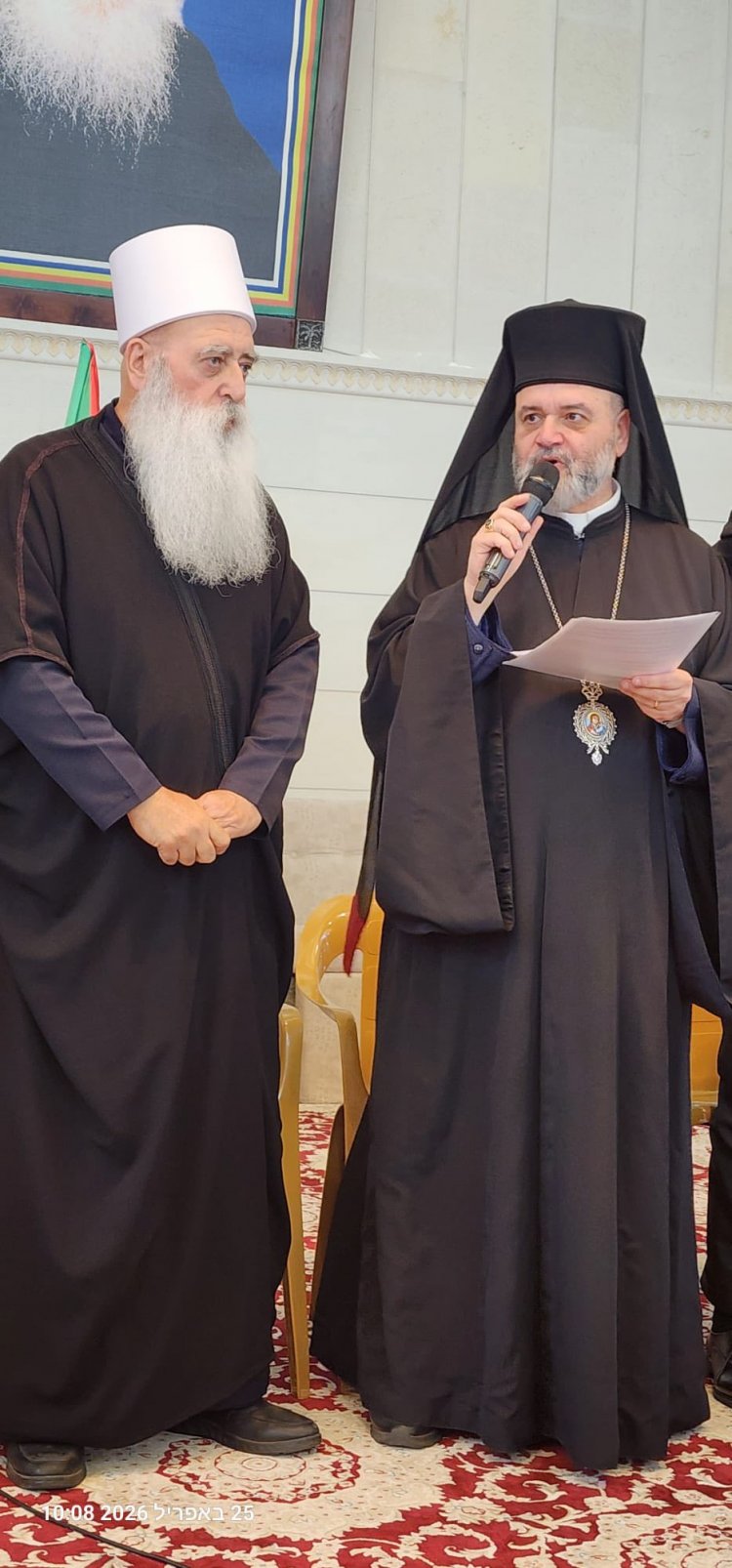 ترأس سيادة المطران يوسف متى، الجزيل الاحترام وفدا من الكهنة والعلمانيين المسيحيين لتقديم التهاني بعيد النبي شعيب، اليوم السبت 25/4/2026 في مقام النبي شعيب في حطين. وقد استقبل الوفد الرئيس الروحي لطائفة الموحدين الدروز في إسرائيل، الشيخ موفق طريف، وعدد كبير من مشايخ الطائفة ووجهائها.