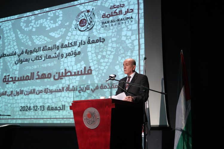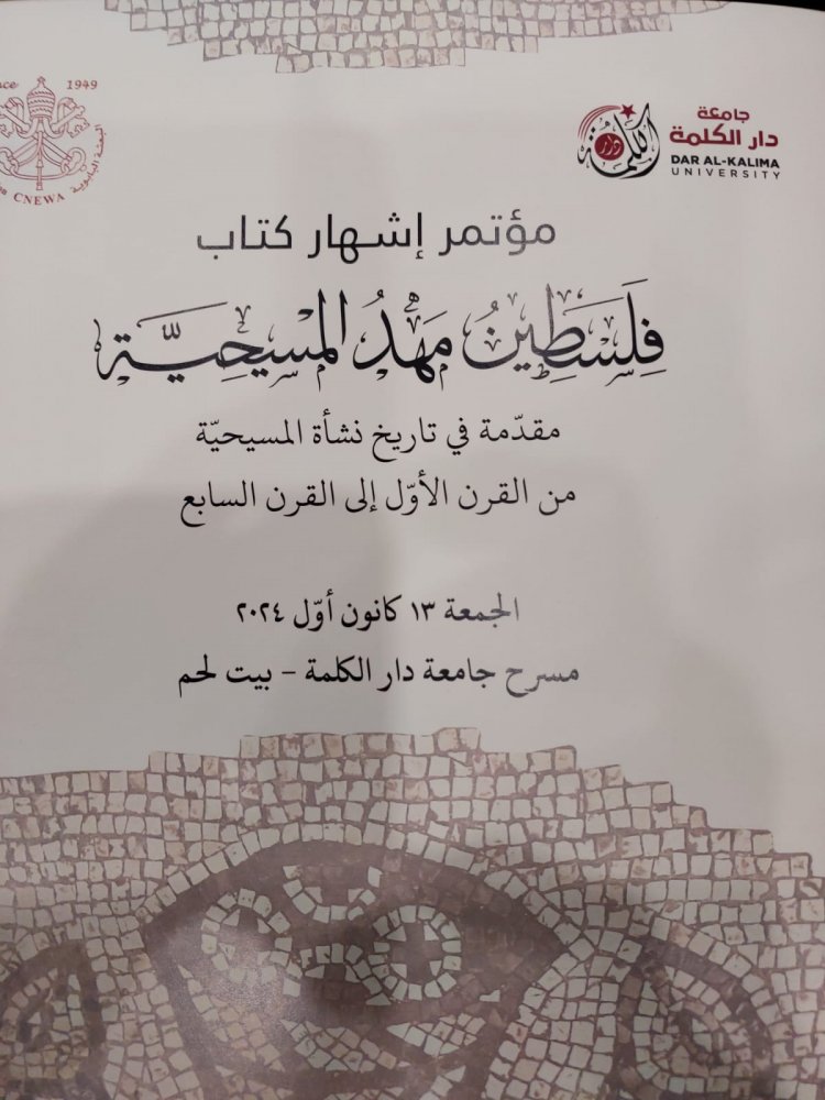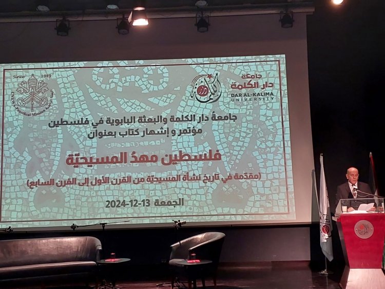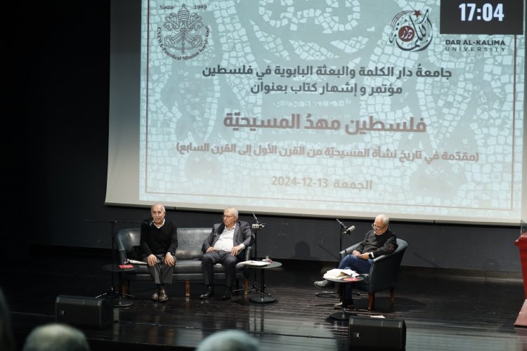 القيامة - عقدت جامعة دار الكلمة في بيت لحم والبعثة البابوية في فلسطين، مؤتمراً لإشهار كتاب بعنوان "فلسطين مهدُ المسيحية: مقدّمة في تاريخ نشأة المسيحيّة من القرن الأول إلى القرن السابع"، يوم الجمعة 13/12/2024 في مسرح جامعة دار الكلمة. وبرز حضور مجموعتين من الجليل الأولى من أعضاء وأصدقاء نادي حيفا الثقافي والثانية من أعضاء منتدى المرشدين السياحيين العرب.