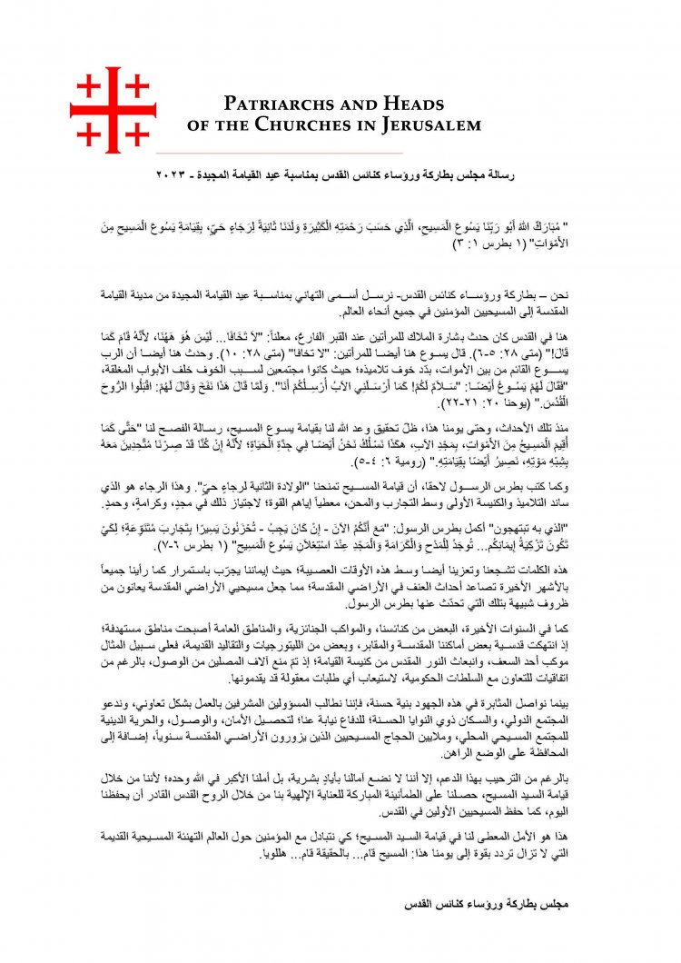 القيامة - أصدر مجلس بطاركة ورؤساء كنائس القدس، رسالة تهاني بمناسبة عيد القيامة المجيدة من مدينة القيامة المقدّسة، إلى المسيحيين المؤمنين في جميع أنحاء العالم، طالب فيها بتحصيل الأمان، والوصول، والحريّة الدينيّة للمجتمع المسيحيّ المحليّ، وملايين الحجّاج المسيحيين الذين يزورون الأراضي المقدّسة سنويًّا.